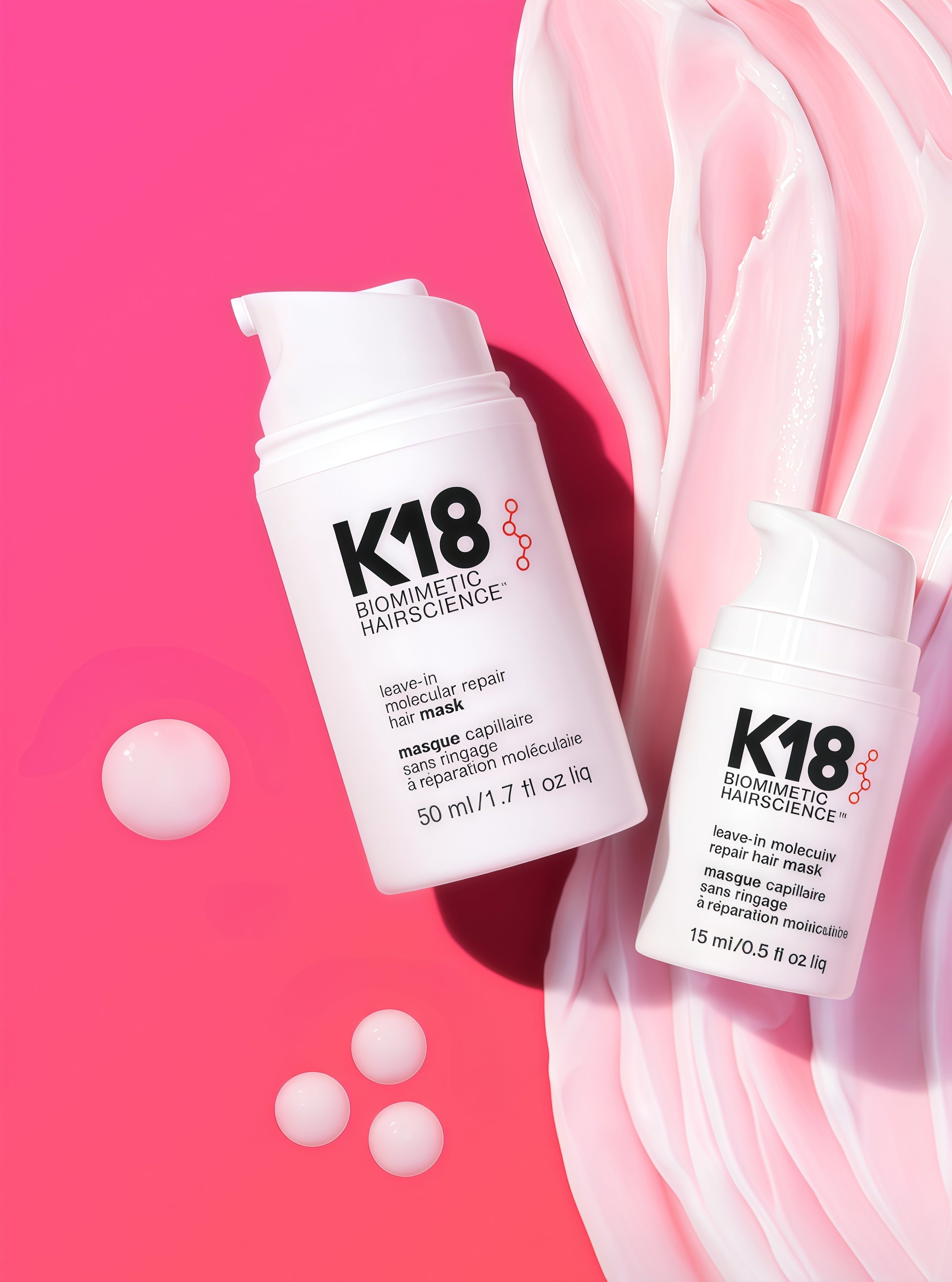 2.Apply 1-3 pumps of K18 leave-in molecular repair hair maskbased onyour length and density, starting at the ends and working up towardsthe roots.